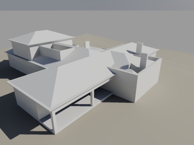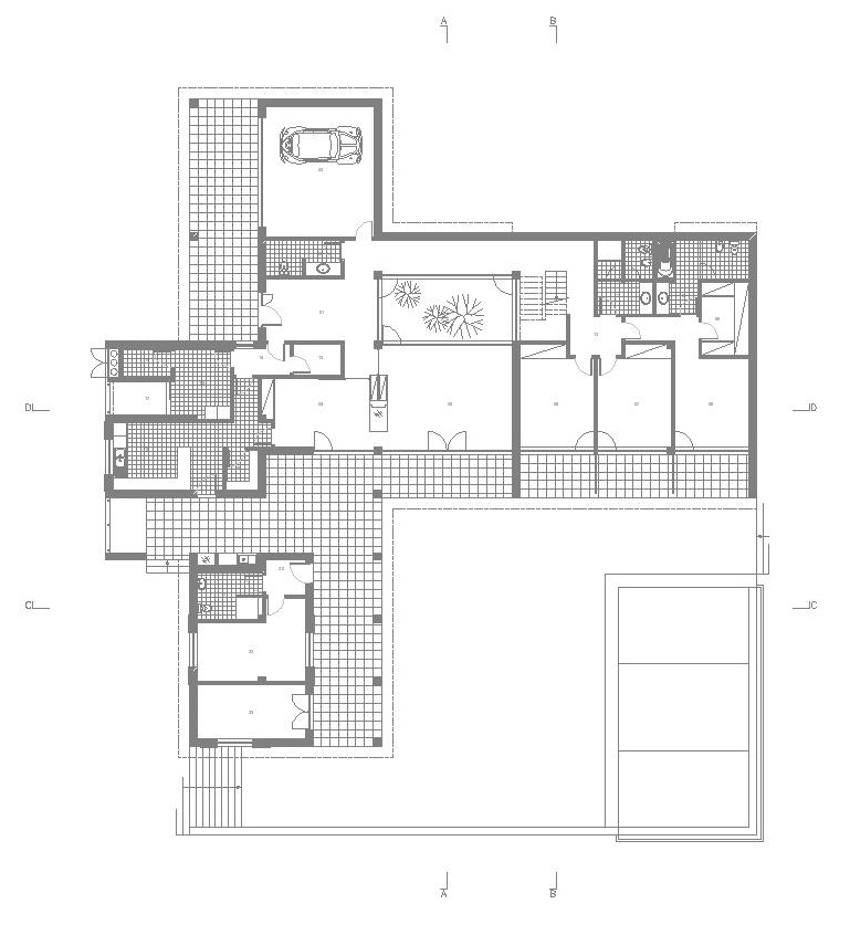 The building is organised like an imperfect cross to create different spaces within the lot. The largest space of the cross creates a private square, and the rooms and living areas of the home receive light from that space.